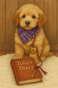Come read my diary. Above you see me and my litter mates. I have on a yellow piece of yarn around my neck to keep track of which puppy I am. My name wasn't always Tallulah. Come read what I was called as soon as I got a piece of yellow yarn around my neck. Come meet Mamma Dixie and my Papa Nash. You can just click on the buttons to peek inside my secret diary.